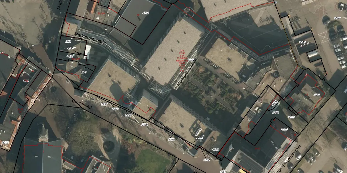 Het perceel waarop Marktpromenade 20 staat heeft een oppervlakte van 8114 m². Dit is een zeer groot perceel. De perceeloppervlakte wordt geregistreerd door het Kadaster. Gedetailleerde informatie over de maten van dit perceel kunt u vinden in het rapport Kadastrale kaart met maatvoering van Marktpromenade 20.