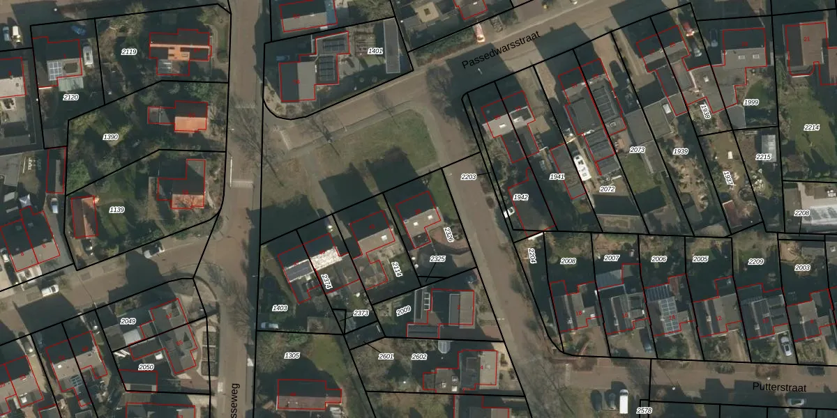 Het perceel waarop Passedwarsstraat 39 staat heeft een oppervlakte van 355 m². Dit is een groot perceel. De perceeloppervlakte wordt geregistreerd door het Kadaster. Gedetailleerde informatie over de maten van dit perceel kunt u vinden in het rapport Kadastrale kaart met maatvoering van Passedwarsstraat 39.