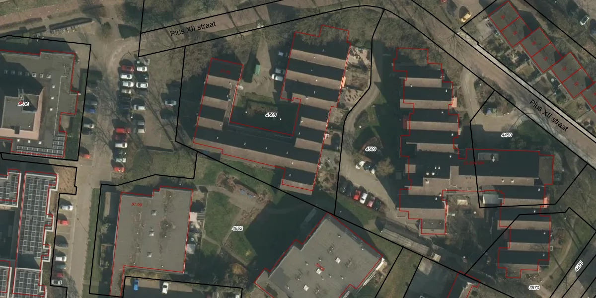Pius XII straat 59 is gelegen op kadastraal perceel WCN00H4508. Deze kadastrale aanduiding is uniek en wordt gebruikt door het Kadaster om eigendomsrechten en andere zakelijke rechten vast te leggen. Het perceel maakt onderdeel uit van de kadastrale gemeente Wijchen.