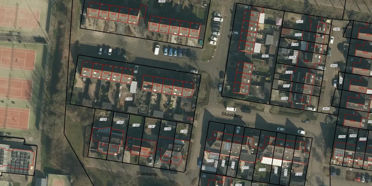 Sluiskamp 3233 is gelegen op kadastraal perceel WCN00F2799. Deze kadastrale aanduiding is uniek en wordt gebruikt door het Kadaster om eigendomsrechten en andere zakelijke rechten vast te leggen. Het perceel maakt onderdeel uit van de kadastrale gemeente Wijchen.