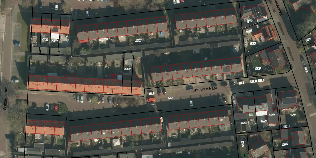 Het perceel waarop Sperwerstraat 20 staat heeft een oppervlakte van 6147 m². Dit is een zeer groot perceel. De perceeloppervlakte wordt geregistreerd door het Kadaster. Gedetailleerde informatie over de maten van dit perceel kunt u vinden in het rapport Kadastrale kaart met maatvoering van Sperwerstraat 20.
