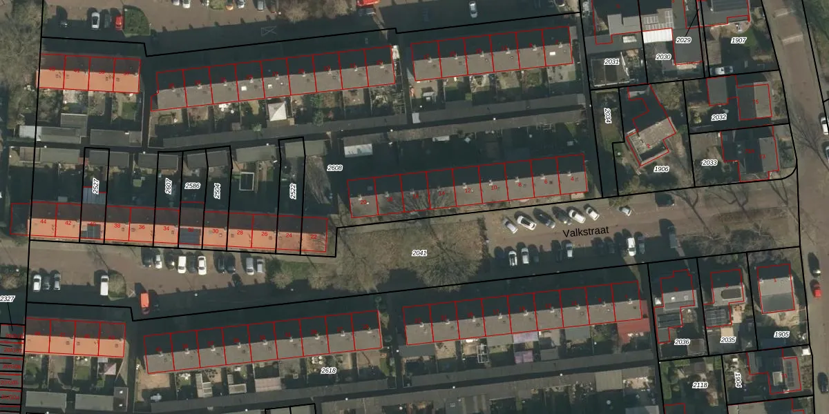 Valkstraat 16 is gelegen op kadastraal perceel WCN00G2608. Deze kadastrale aanduiding is uniek en wordt gebruikt door het Kadaster om eigendomsrechten en andere zakelijke rechten vast te leggen. Het perceel maakt onderdeel uit van de kadastrale gemeente Wijchen.