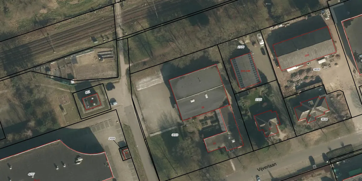Het perceel waarop Vijverlaan 26 staat heeft een oppervlakte van 3370 m². Dit is een zeer groot perceel. De perceeloppervlakte wordt geregistreerd door het Kadaster. Gedetailleerde informatie over de maten van dit perceel kunt u vinden in het rapport Kadastrale kaart met maatvoering van Vijverlaan 26.