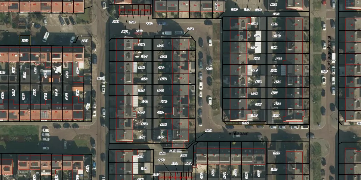 Vinkstraat 21 is gelegen op kadastraal perceel WCN00G1781. Deze kadastrale aanduiding is uniek en wordt gebruikt door het Kadaster om eigendomsrechten en andere zakelijke rechten vast te leggen. Het perceel maakt onderdeel uit van de kadastrale gemeente Wijchen.