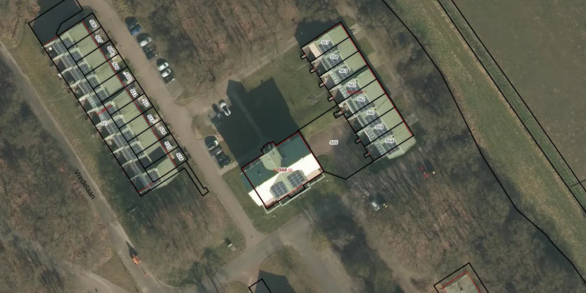 Vredelaan 45 is gelegen op kadastraal perceel WCN00Q553. Deze kadastrale aanduiding is uniek en wordt gebruikt door het Kadaster om eigendomsrechten en andere zakelijke rechten vast te leggen. Het perceel maakt onderdeel uit van de kadastrale gemeente Wijchen.