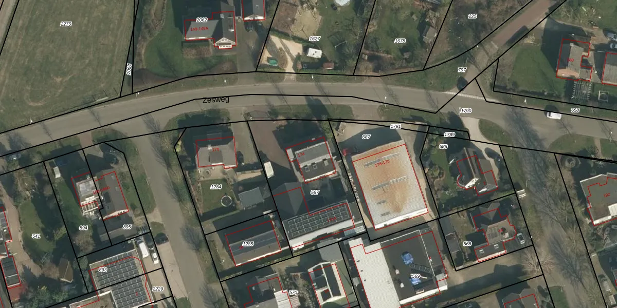 Zesweg 174 is gelegen op kadastraal perceel WCN00K567. Deze kadastrale aanduiding is uniek en wordt gebruikt door het Kadaster om eigendomsrechten en andere zakelijke rechten vast te leggen. Het perceel maakt onderdeel uit van de kadastrale gemeente Wijchen.