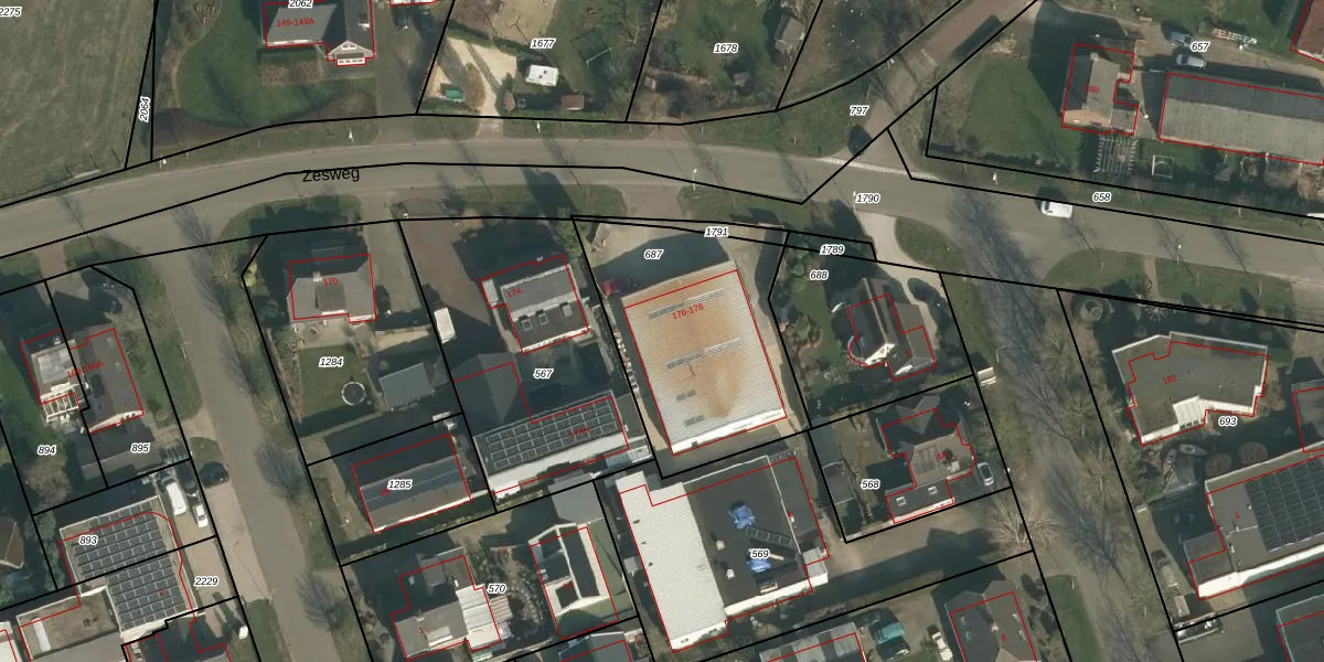 Zesweg 176 is gelegen op kadastraal perceel WCN00K687. Deze kadastrale aanduiding is uniek en wordt gebruikt door het Kadaster om eigendomsrechten en andere zakelijke rechten vast te leggen. Het perceel maakt onderdeel uit van de kadastrale gemeente Wijchen.