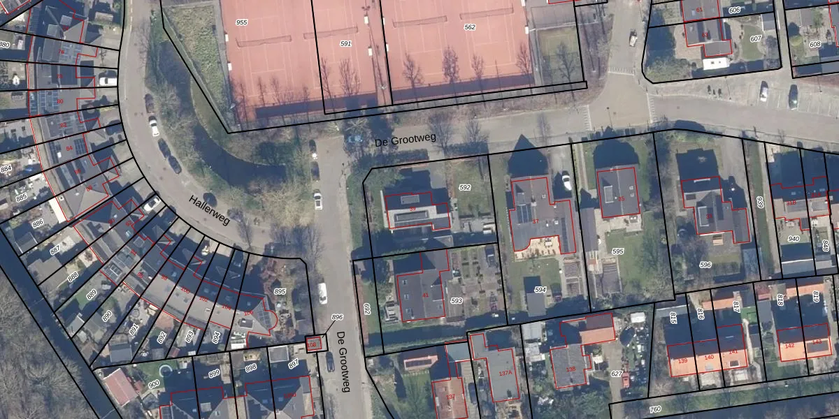 Het perceel waarop De Grootweg 39 staat heeft een oppervlakte van 634 m². Dit is een groot perceel. De perceeloppervlakte wordt geregistreerd door het Kadaster. Gedetailleerde informatie over de maten van dit perceel kunt u vinden in het rapport Kadastrale kaart met maatvoering van De Grootweg 39.