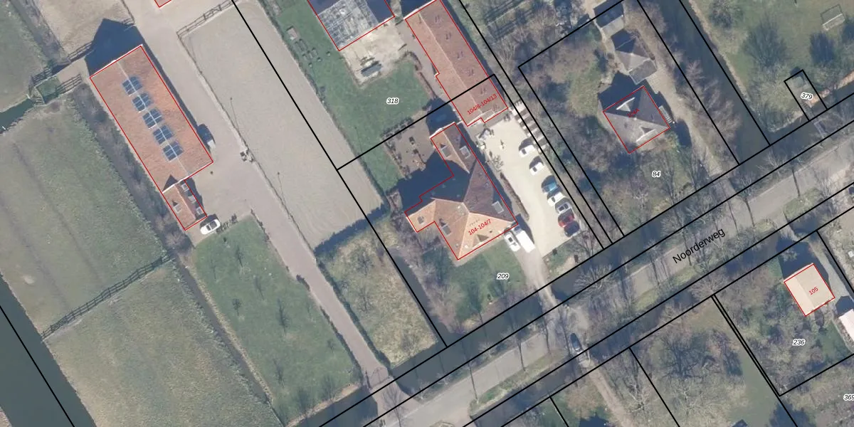 Het perceel waarop Noorderweg 104-1 staat heeft een oppervlakte van 2020 m². Dit is een zeer groot perceel. De perceeloppervlakte wordt geregistreerd door het Kadaster. Gedetailleerde informatie over de maten van dit perceel kunt u vinden in het rapport Kadastrale kaart met maatvoering van Noorderweg 104-1.