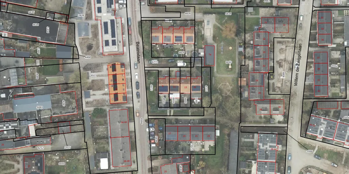 Gebruik de zoekbalk of klik op een perceel voor informatie over de adressen binnen dit perceel.