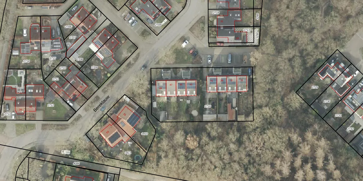 Het perceel waarop Bereklauw 45 staat heeft een oppervlakte van 1661 m². Dit is een zeer groot perceel. De perceeloppervlakte wordt geregistreerd door het Kadaster. Gedetailleerde informatie over de maten van dit perceel kunt u vinden in het rapport Kadastrale kaart met maatvoering van Bereklauw 45.