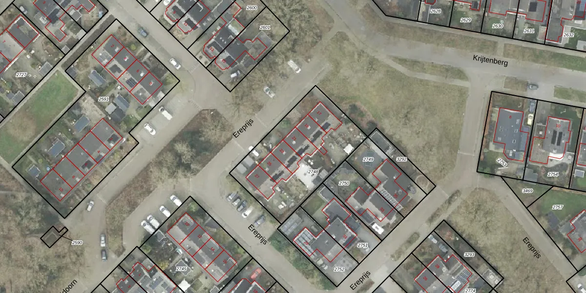 Het perceel waarop Ereprijs 21 staat heeft een oppervlakte van 1053 m². Dit is een zeer groot perceel. De perceeloppervlakte wordt geregistreerd door het Kadaster. Gedetailleerde informatie over de maten van dit perceel kunt u vinden in het rapport Kadastrale kaart met maatvoering van Ereprijs 21.