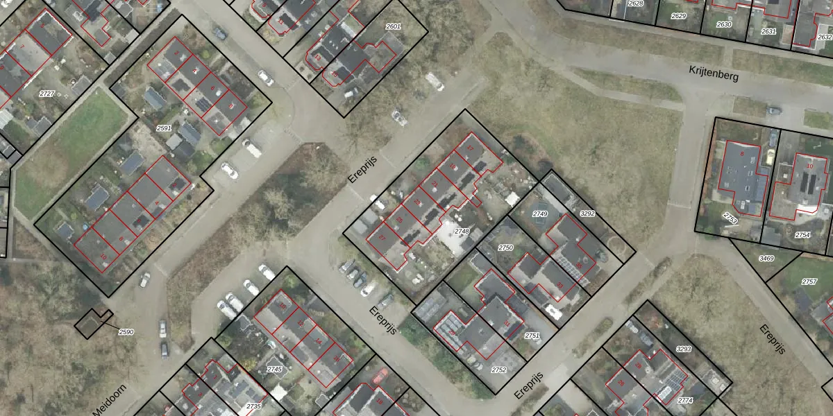 Het perceel waarop Ereprijs 23 staat heeft een oppervlakte van 1053 m². Dit is een zeer groot perceel. De perceeloppervlakte wordt geregistreerd door het Kadaster. Gedetailleerde informatie over de maten van dit perceel kunt u vinden in het rapport Kadastrale kaart met maatvoering van Ereprijs 23.