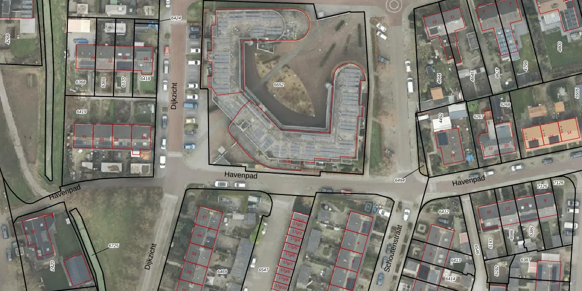 Het perceel waarop Havenpad 56 staat heeft een oppervlakte van 3150 m². Dit is een zeer groot perceel. De perceeloppervlakte wordt geregistreerd door het Kadaster. Gedetailleerde informatie over de maten van dit perceel kunt u vinden in het rapport Kadastrale kaart met maatvoering van Havenpad 56.