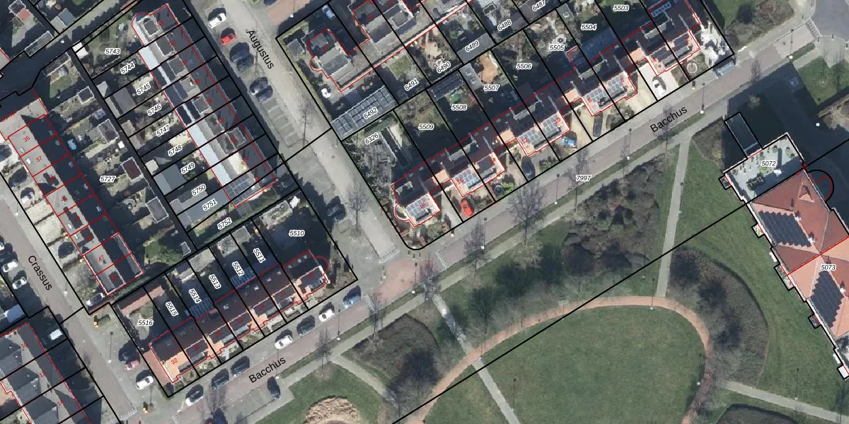 Het perceel waarop Bacchus 18 staat heeft een oppervlakte van 450 m². Dit is een groot perceel. De perceeloppervlakte wordt geregistreerd door het Kadaster. Gedetailleerde informatie over de maten van dit perceel kunt u vinden in het rapport Kadastrale kaart met maatvoering van Bacchus 18.
