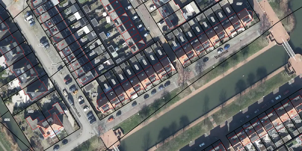 Het perceel waarop Bacchus 56 staat heeft een oppervlakte van 147 m². Dit is een middelgroot perceel. De perceeloppervlakte wordt geregistreerd door het Kadaster. Gedetailleerde informatie over de maten van dit perceel kunt u vinden in het rapport Kadastrale kaart met maatvoering van Bacchus 56.
