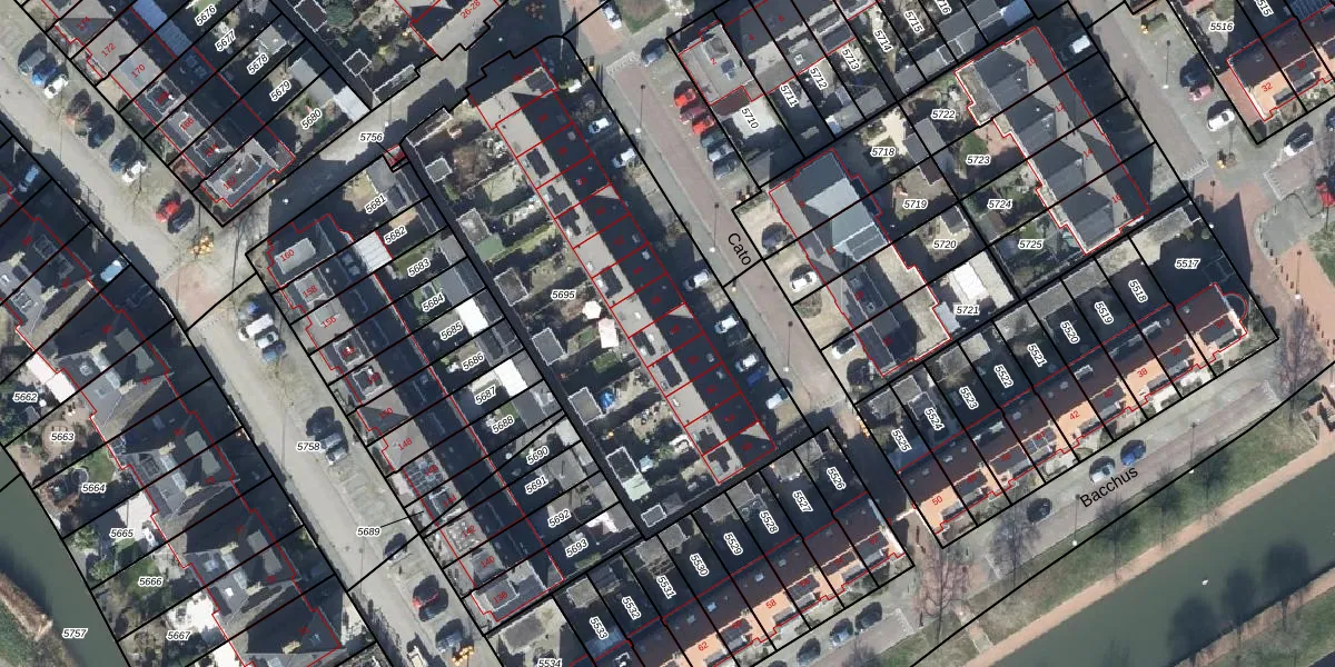 Het perceel waarop Cato 48 staat heeft een oppervlakte van 2133 m². Dit is een zeer groot perceel. De perceeloppervlakte wordt geregistreerd door het Kadaster. Gedetailleerde informatie over de maten van dit perceel kunt u vinden in het rapport Kadastrale kaart met maatvoering van Cato 48.