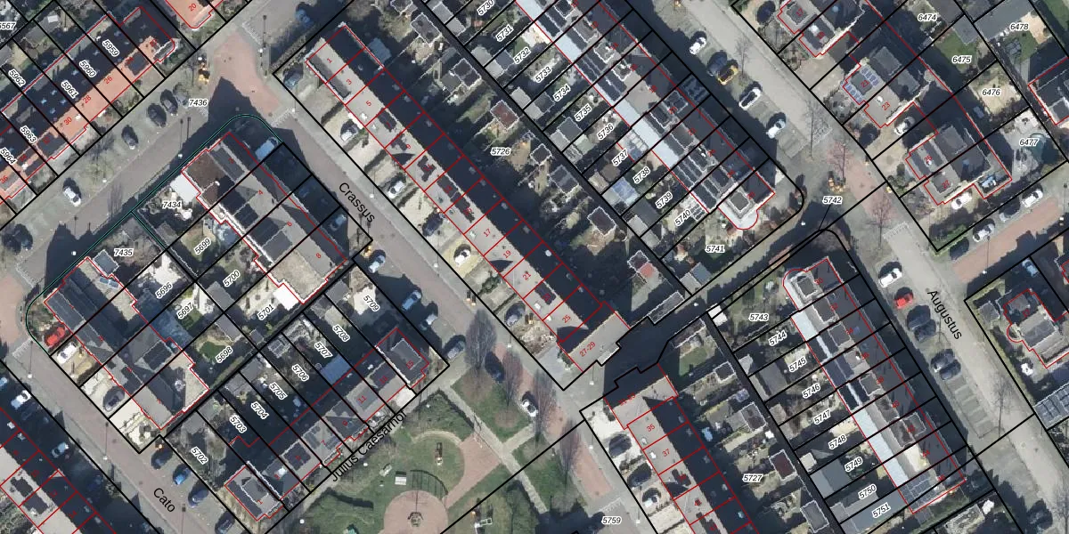 Het perceel waarop Crassus 21 staat heeft een oppervlakte van 2428 m². Dit is een zeer groot perceel. De perceeloppervlakte wordt geregistreerd door het Kadaster. Gedetailleerde informatie over de maten van dit perceel kunt u vinden in het rapport Kadastrale kaart met maatvoering van Crassus 21.