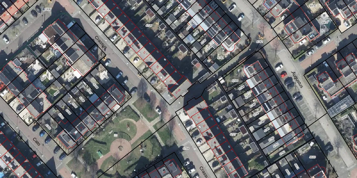 Het perceel waarop Crassus 27 staat heeft een oppervlakte van 2428 m². Dit is een zeer groot perceel. De perceeloppervlakte wordt geregistreerd door het Kadaster. Gedetailleerde informatie over de maten van dit perceel kunt u vinden in het rapport Kadastrale kaart met maatvoering van Crassus 27.