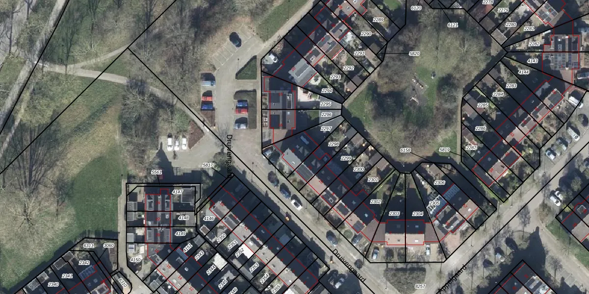 Het perceel waarop Druivengaard 14 staat heeft een oppervlakte van 225 m². Dit is een middelgroot perceel. De perceeloppervlakte wordt geregistreerd door het Kadaster. Gedetailleerde informatie over de maten van dit perceel kunt u vinden in het rapport Kadastrale kaart met maatvoering van Druivengaard 14.