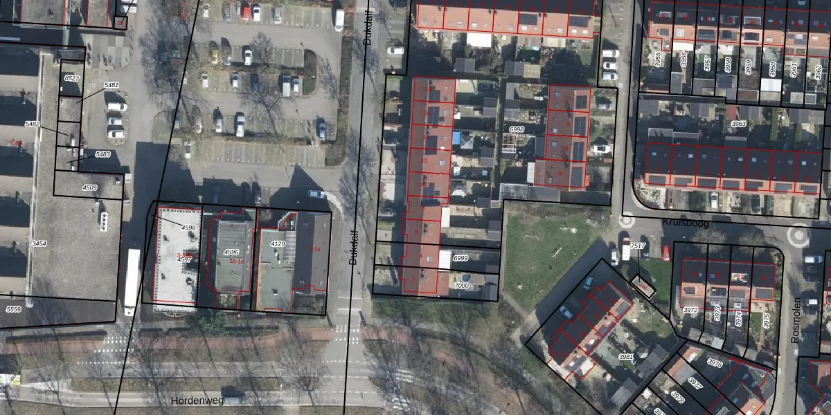 Het perceel waarop Dukdalf 8 staat heeft een oppervlakte van 3237 m². Dit is een zeer groot perceel. De perceeloppervlakte wordt geregistreerd door het Kadaster. Gedetailleerde informatie over de maten van dit perceel kunt u vinden in het rapport Kadastrale kaart met maatvoering van Dukdalf 8.