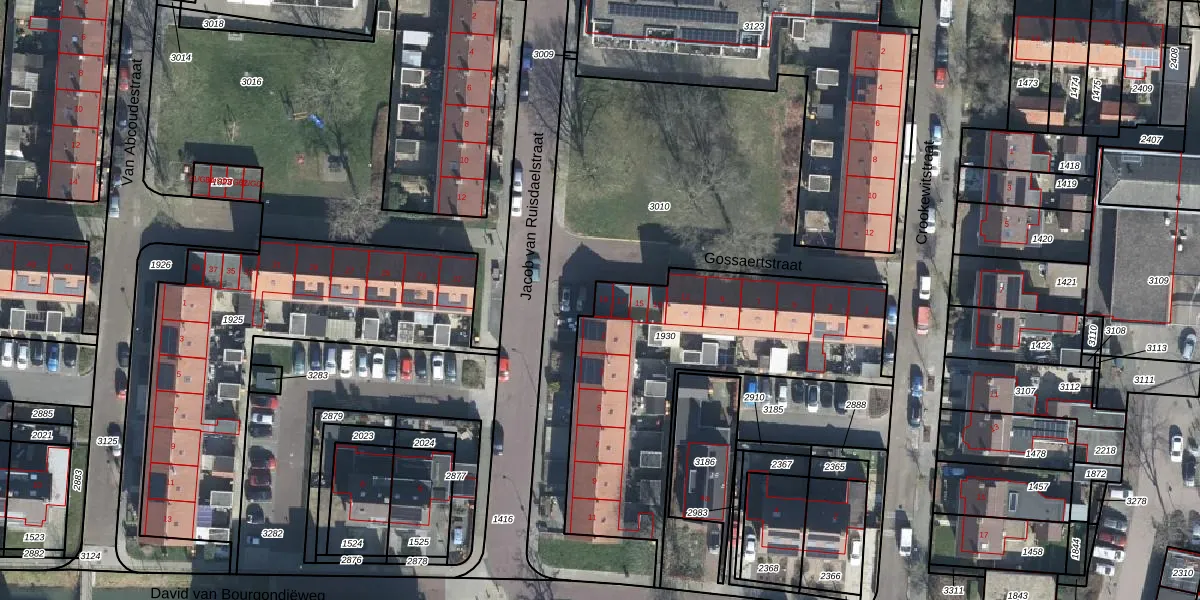 Het perceel waarop Gossaertstraat 19 staat heeft een oppervlakte van 1271 m². Dit is een zeer groot perceel. De perceeloppervlakte wordt geregistreerd door het Kadaster. Gedetailleerde informatie over de maten van dit perceel kunt u vinden in het rapport Kadastrale kaart met maatvoering van Gossaertstraat 19.