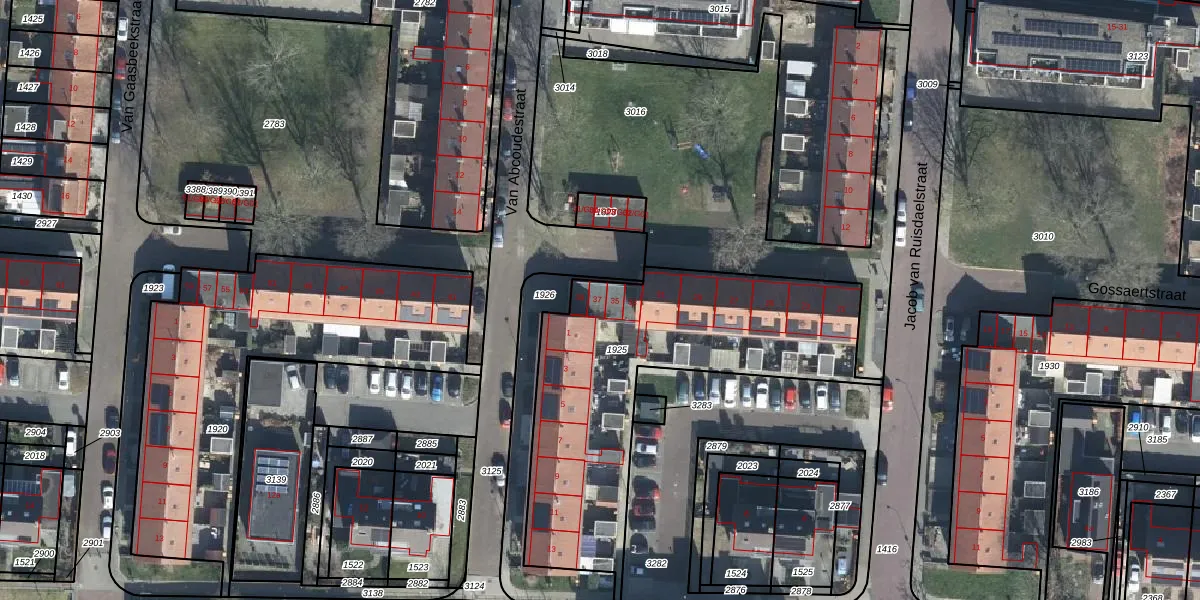 Het perceel waarop Gossaertstraat 37 staat heeft een oppervlakte van 1387 m². Dit is een zeer groot perceel. De perceeloppervlakte wordt geregistreerd door het Kadaster. Gedetailleerde informatie over de maten van dit perceel kunt u vinden in het rapport Kadastrale kaart met maatvoering van Gossaertstraat 37.