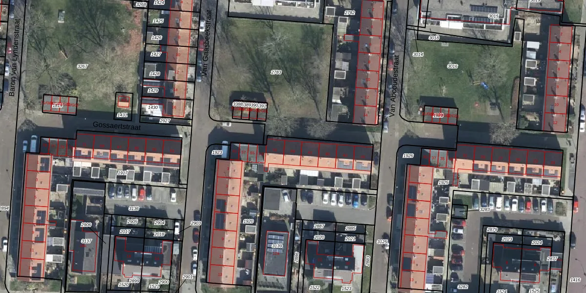 Het perceel waarop Gossaertstraat 49 staat heeft een oppervlakte van 1385 m². Dit is een zeer groot perceel. De perceeloppervlakte wordt geregistreerd door het Kadaster. Gedetailleerde informatie over de maten van dit perceel kunt u vinden in het rapport Kadastrale kaart met maatvoering van Gossaertstraat 49.
