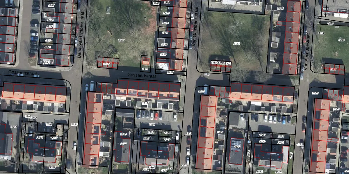 Het perceel waarop Gossaertstraat 61 staat heeft een oppervlakte van 1392 m². Dit is een zeer groot perceel. De perceeloppervlakte wordt geregistreerd door het Kadaster. Gedetailleerde informatie over de maten van dit perceel kunt u vinden in het rapport Kadastrale kaart met maatvoering van Gossaertstraat 61.