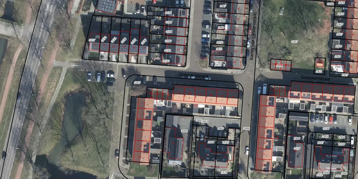 Het perceel waarop Gossaertstraat 91 staat heeft een oppervlakte van 1438 m². Dit is een zeer groot perceel. De perceeloppervlakte wordt geregistreerd door het Kadaster. Gedetailleerde informatie over de maten van dit perceel kunt u vinden in het rapport Kadastrale kaart met maatvoering van Gossaertstraat 91.