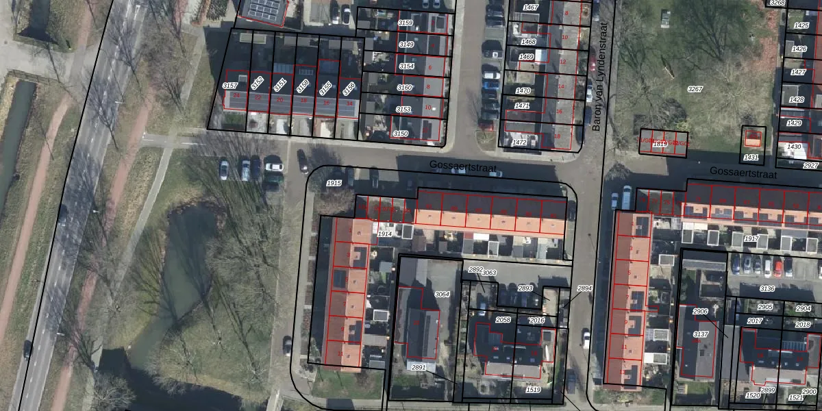 Het perceel waarop Gossaertstraat 93 staat heeft een oppervlakte van 1438 m². Dit is een zeer groot perceel. De perceeloppervlakte wordt geregistreerd door het Kadaster. Gedetailleerde informatie over de maten van dit perceel kunt u vinden in het rapport Kadastrale kaart met maatvoering van Gossaertstraat 93.