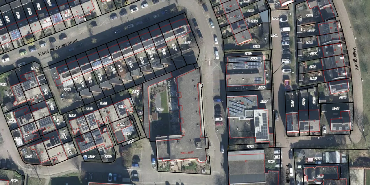 Het perceel waarop Karel de Grotestraat 26-21 staat heeft een oppervlakte van 1665 m². Dit is een zeer groot perceel. De perceeloppervlakte wordt geregistreerd door het Kadaster. Gedetailleerde informatie over de maten van dit perceel kunt u vinden in het rapport Kadastrale kaart met maatvoering van Karel de Grotestraat 26-21.
