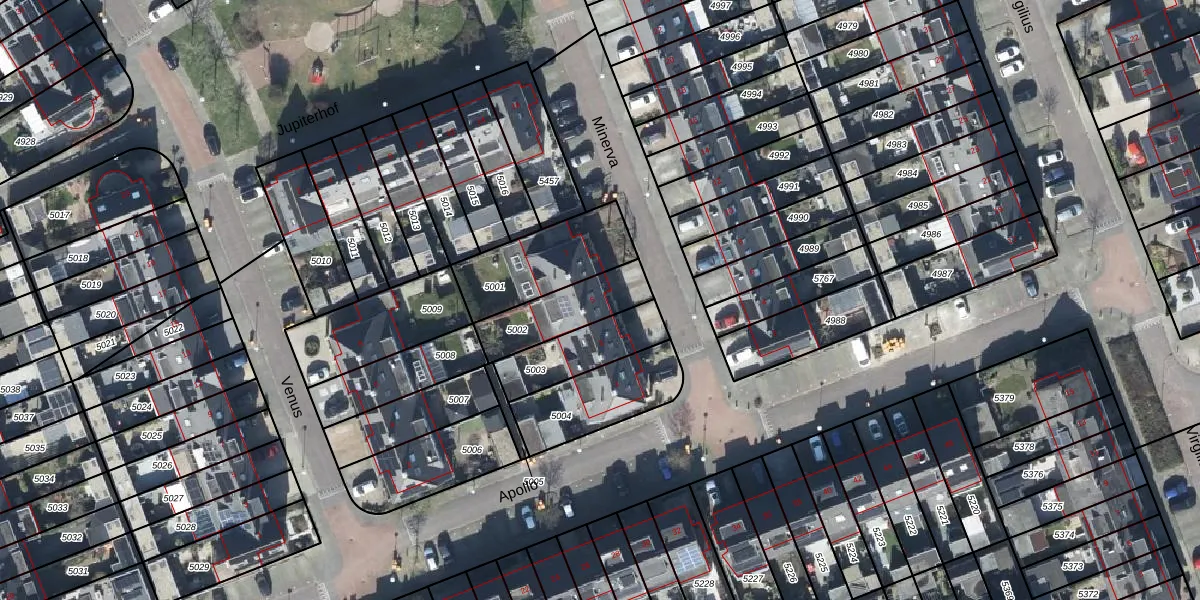 Het perceel waarop Minerva 5 staat heeft een oppervlakte van 214 m². Dit is een middelgroot perceel. De perceeloppervlakte wordt geregistreerd door het Kadaster. Gedetailleerde informatie over de maten van dit perceel kunt u vinden in het rapport Kadastrale kaart met maatvoering van Minerva 5.