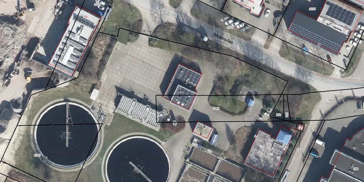 Het perceel waarop Molenvliet 21 staat heeft een oppervlakte van 1,1 ha. Dit is een zeer groot perceel. De perceeloppervlakte wordt geregistreerd door het Kadaster. Gedetailleerde informatie over de maten van dit perceel kunt u vinden in het rapport Kadastrale kaart met maatvoering van Molenvliet 21.