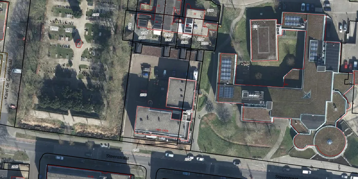 Het perceel waarop Steenstraat 14-21 staat heeft een oppervlakte van 1666 m². Dit is een zeer groot perceel. De perceeloppervlakte wordt geregistreerd door het Kadaster. Gedetailleerde informatie over de maten van dit perceel kunt u vinden in het rapport Kadastrale kaart met maatvoering van Steenstraat 14-21.