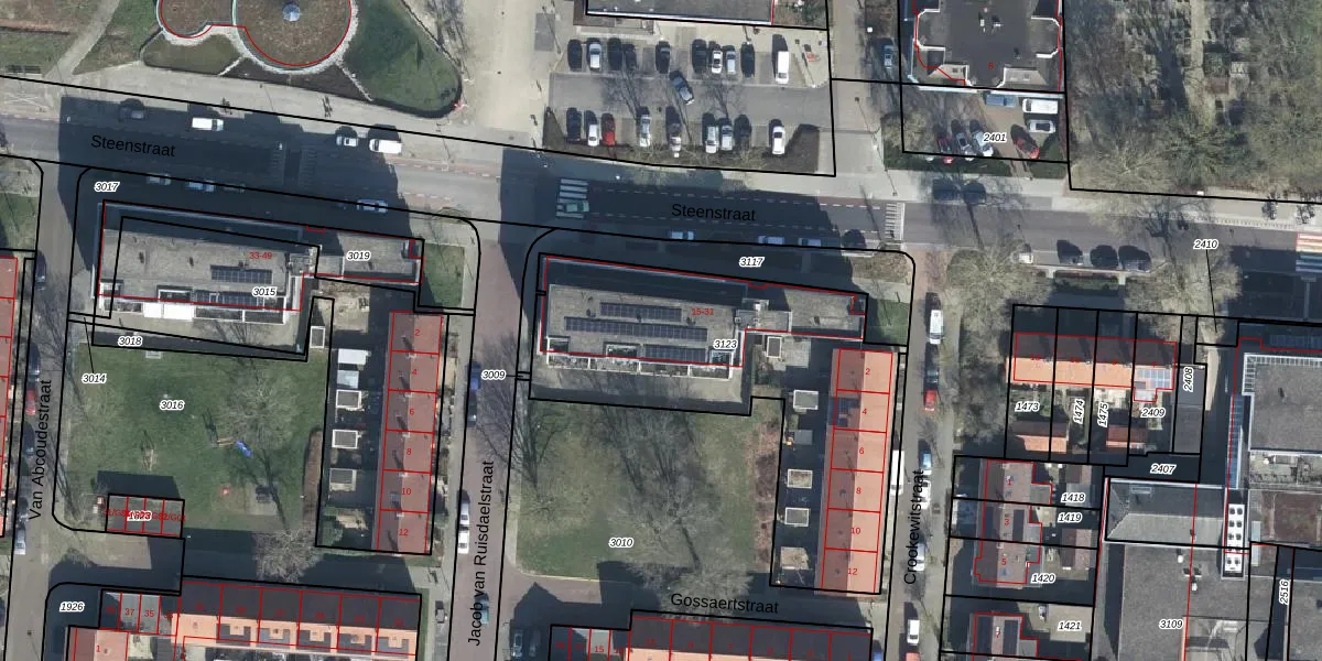 Het perceel waarop Steenstraat 25 staat heeft een oppervlakte van 1534 m². Dit is een zeer groot perceel. De perceeloppervlakte wordt geregistreerd door het Kadaster. Gedetailleerde informatie over de maten van dit perceel kunt u vinden in het rapport Kadastrale kaart met maatvoering van Steenstraat 25.
