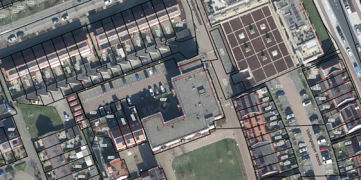 Het perceel waarop Veilingmeester 25 staat heeft een oppervlakte van 2315 m². Dit is een zeer groot perceel. De perceeloppervlakte wordt geregistreerd door het Kadaster. Gedetailleerde informatie over de maten van dit perceel kunt u vinden in het rapport Kadastrale kaart met maatvoering van Veilingmeester 25.