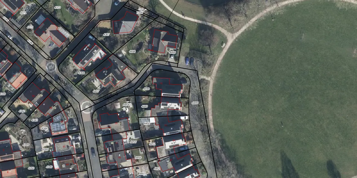 Het perceel waarop Vesting 75 staat heeft een oppervlakte van 371 m². Dit is een groot perceel. De perceeloppervlakte wordt geregistreerd door het Kadaster. Gedetailleerde informatie over de maten van dit perceel kunt u vinden in het rapport Kadastrale kaart met maatvoering van Vesting 75.