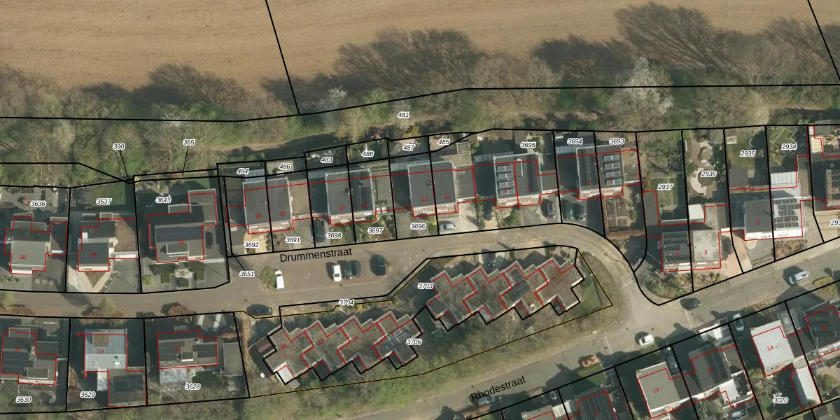 Drummenstraat 12 is gelegen op kadastraal perceel WNR00A3696. Deze kadastrale aanduiding is uniek en wordt gebruikt door het Kadaster om eigendomsrechten en andere zakelijke rechten vast te leggen. Het perceel maakt onderdeel uit van de kadastrale gemeente Wijnandsrade.