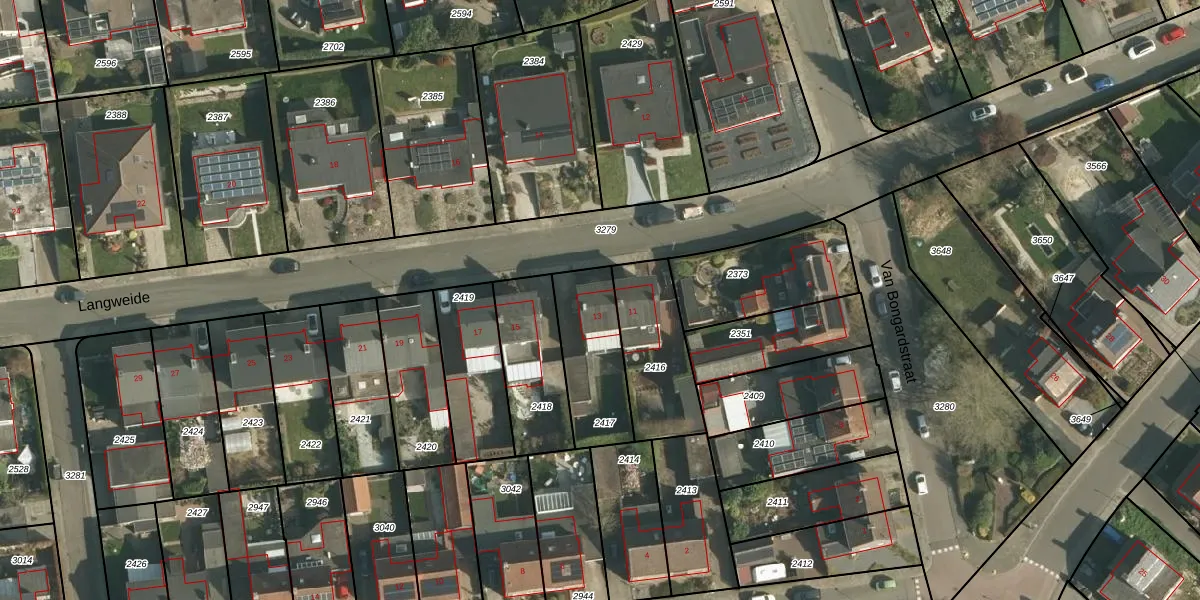 Langweide 13 is gelegen op kadastraal perceel WNR00A2417. Deze kadastrale aanduiding is uniek en wordt gebruikt door het Kadaster om eigendomsrechten en andere zakelijke rechten vast te leggen. Het perceel maakt onderdeel uit van de kadastrale gemeente Wijnandsrade.