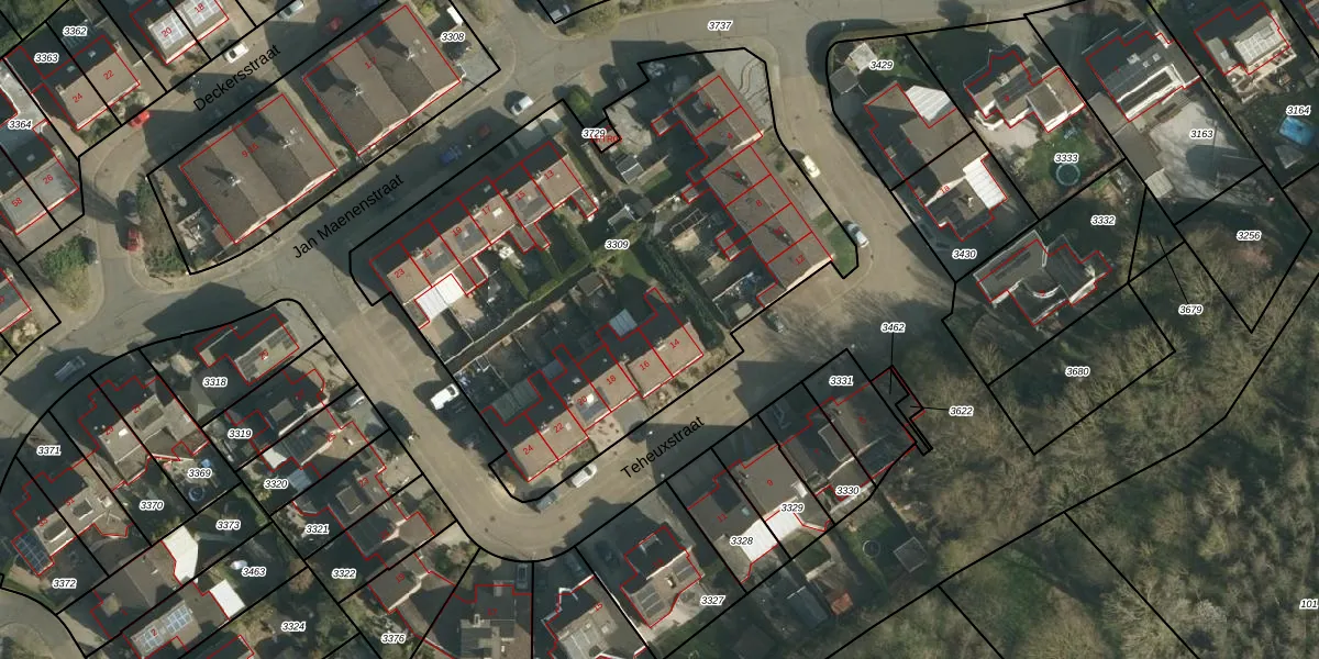 Teheuxstraat 14 is gelegen op kadastraal perceel WNR00A3309. Deze kadastrale aanduiding is uniek en wordt gebruikt door het Kadaster om eigendomsrechten en andere zakelijke rechten vast te leggen. Het perceel maakt onderdeel uit van de kadastrale gemeente Wijnandsrade.