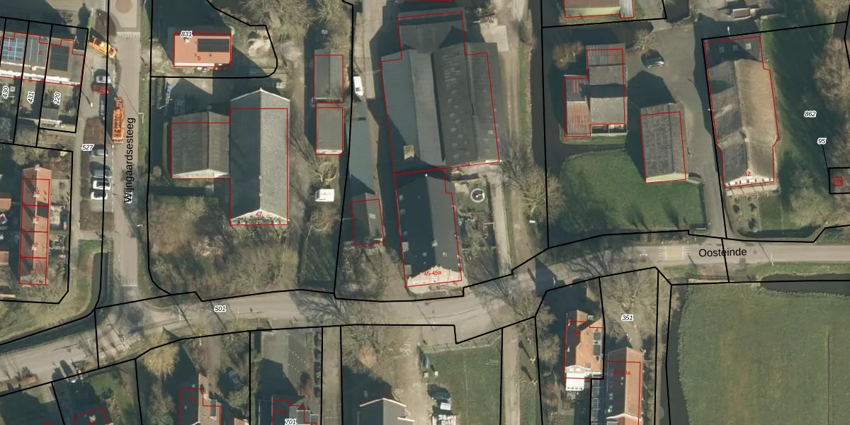 Het perceel waarop Oosteinde 45-a staat heeft een oppervlakte van 5,9 ha. Dit is een zeer groot perceel. De perceeloppervlakte wordt geregistreerd door het Kadaster. Gedetailleerde informatie over de maten van dit perceel kunt u vinden in het rapport Kadastrale kaart met maatvoering van Oosteinde 45-a.