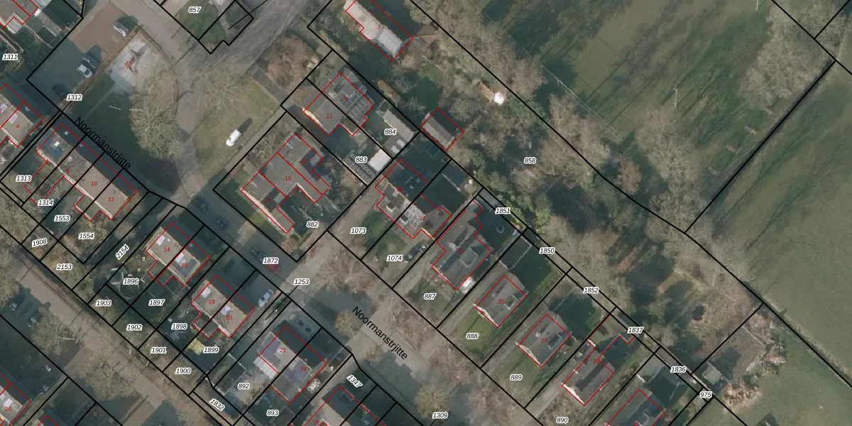 Het perceel waarop Noormanstrjitte 21 staat heeft een oppervlakte van 326 m². Dit is een groot perceel. De perceeloppervlakte wordt geregistreerd door het Kadaster. Gedetailleerde informatie over de maten van dit perceel kunt u vinden in het rapport Kadastrale kaart met maatvoering van Noormanstrjitte 21.
