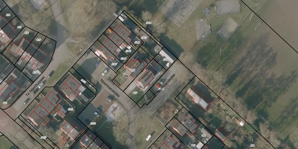 Het perceel waarop Noormanstrjitte 3 staat heeft een oppervlakte van 362 m². Dit is een groot perceel. De perceeloppervlakte wordt geregistreerd door het Kadaster. Gedetailleerde informatie over de maten van dit perceel kunt u vinden in het rapport Kadastrale kaart met maatvoering van Noormanstrjitte 3.