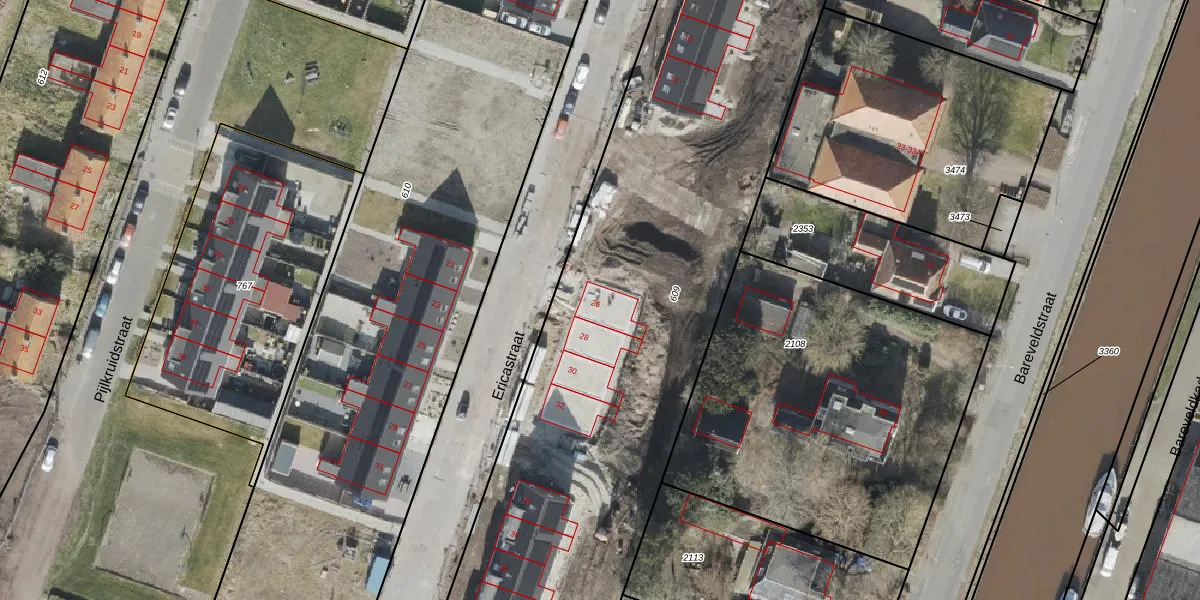 Het perceel waarop Ericastraat 26 staat heeft een oppervlakte van 4400 m². Dit is een zeer groot perceel. De perceeloppervlakte wordt geregistreerd door het Kadaster. Gedetailleerde informatie over de maten van dit perceel kunt u vinden in het rapport Kadastrale kaart met maatvoering van Ericastraat 26.