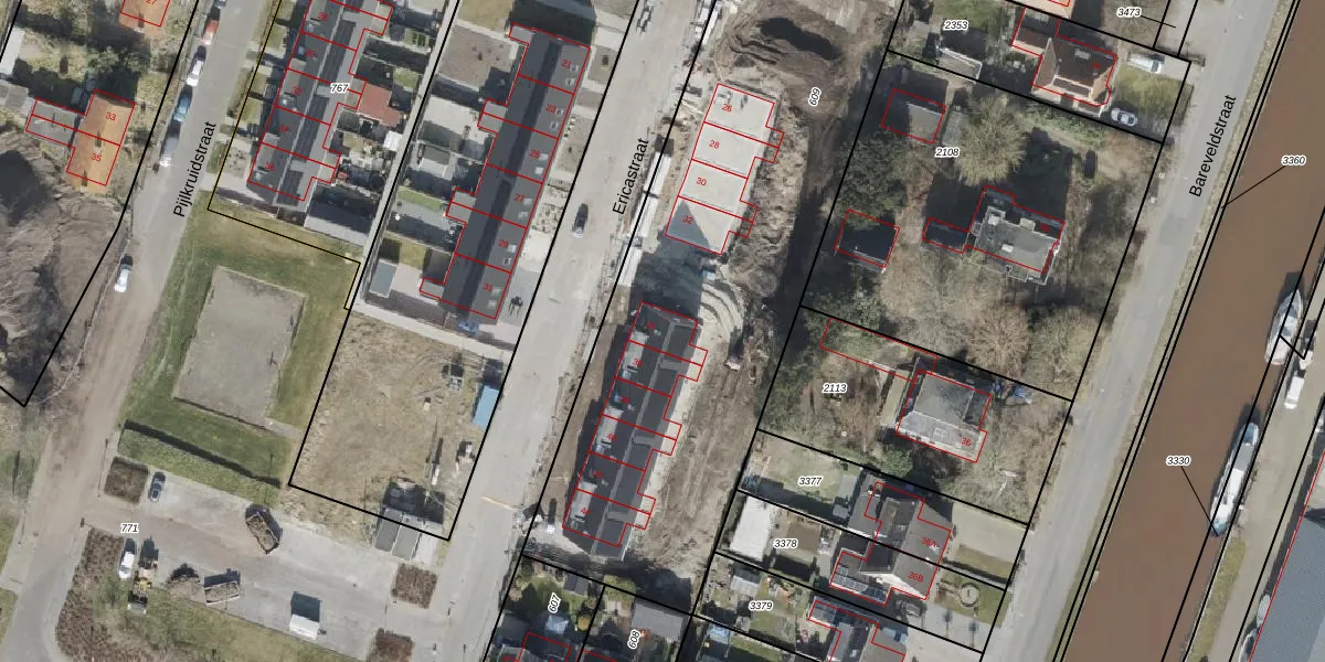 Het perceel waarop Ericastraat 34 staat heeft een oppervlakte van 4400 m². Dit is een zeer groot perceel. De perceeloppervlakte wordt geregistreerd door het Kadaster. Gedetailleerde informatie over de maten van dit perceel kunt u vinden in het rapport Kadastrale kaart met maatvoering van Ericastraat 34.