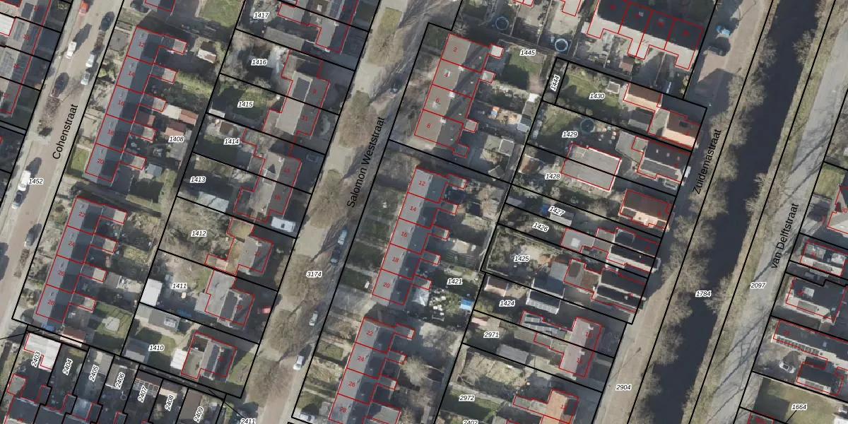 Het perceel waarop Salomon Weststraat 14 staat heeft een oppervlakte van 2197 m². Dit is een zeer groot perceel. De perceeloppervlakte wordt geregistreerd door het Kadaster. Gedetailleerde informatie over de maten van dit perceel kunt u vinden in het rapport Kadastrale kaart met maatvoering van Salomon Weststraat 14.