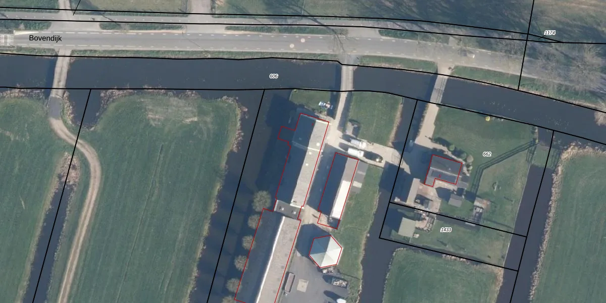Het perceel waarop Bovendijk 7 staat heeft een oppervlakte van 1,2 ha. Dit is een zeer groot perceel. De perceeloppervlakte wordt geregistreerd door het Kadaster. Gedetailleerde informatie over de maten van dit perceel kunt u vinden in het rapport Kadastrale kaart met maatvoering van Bovendijk 7.