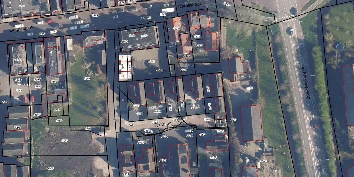 Het perceel waarop De Baan 5 staat heeft een oppervlakte van 91 m². Dit is een klein perceel. De perceeloppervlakte wordt geregistreerd door het Kadaster. Gedetailleerde informatie over de maten van dit perceel kunt u vinden in het rapport Kadastrale kaart met maatvoering van De Baan 5.