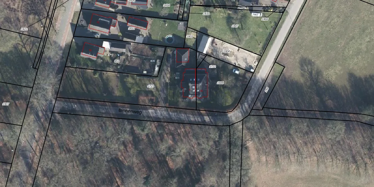 Het perceel waarop Binnenweg 3 staat heeft een oppervlakte van 1455 m². Dit is een zeer groot perceel. De perceeloppervlakte wordt geregistreerd door het Kadaster. Gedetailleerde informatie over de maten van dit perceel kunt u vinden in het rapport Kadastrale kaart met maatvoering van Binnenweg 3.